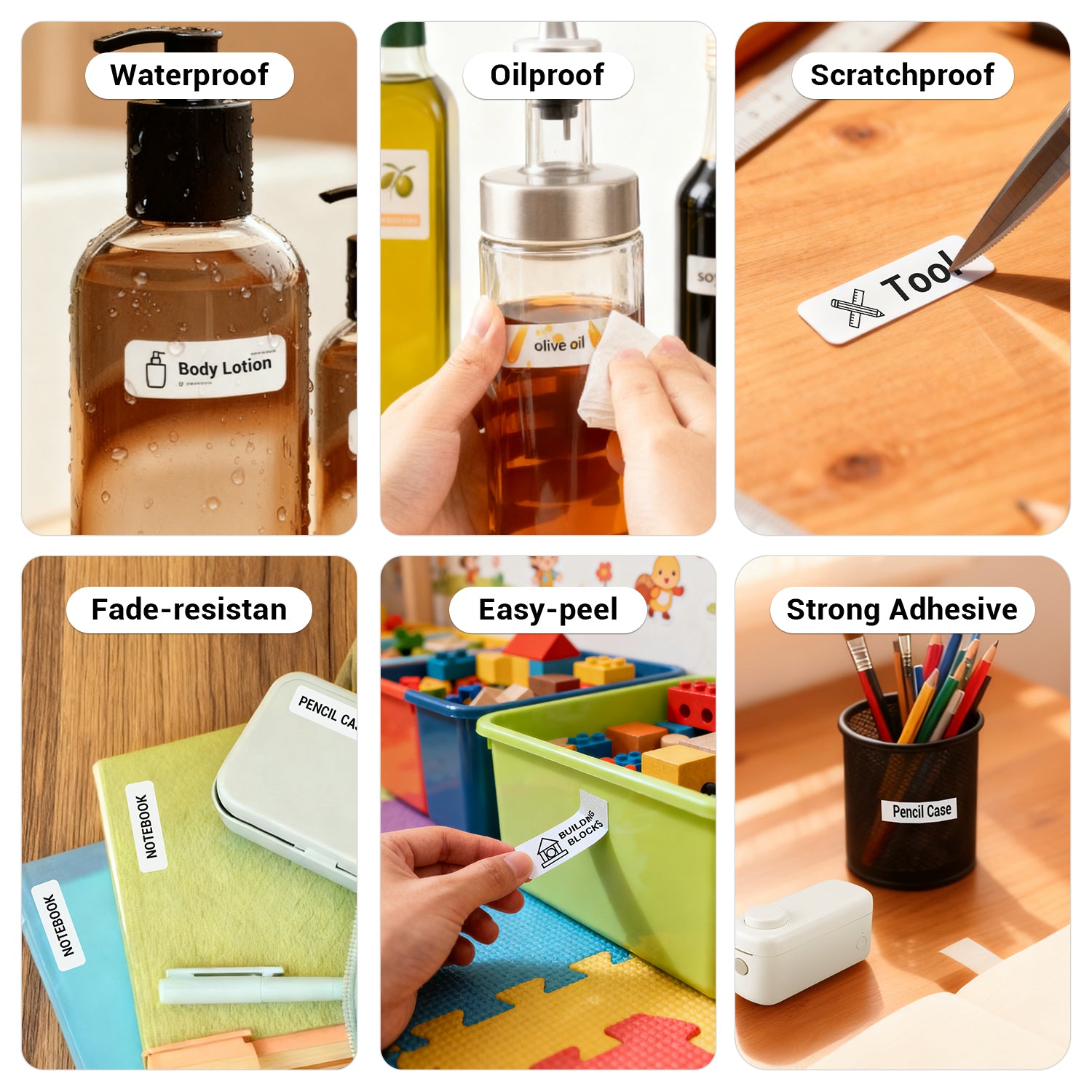 Waterproof, scratch-proof, and fade-resistant, Compatible with high-quality label tapes that stick firmly to jars, folders, shelves, and other surfaces. Your labels stay readable and intact for everyday use, even in busy or humid environments.