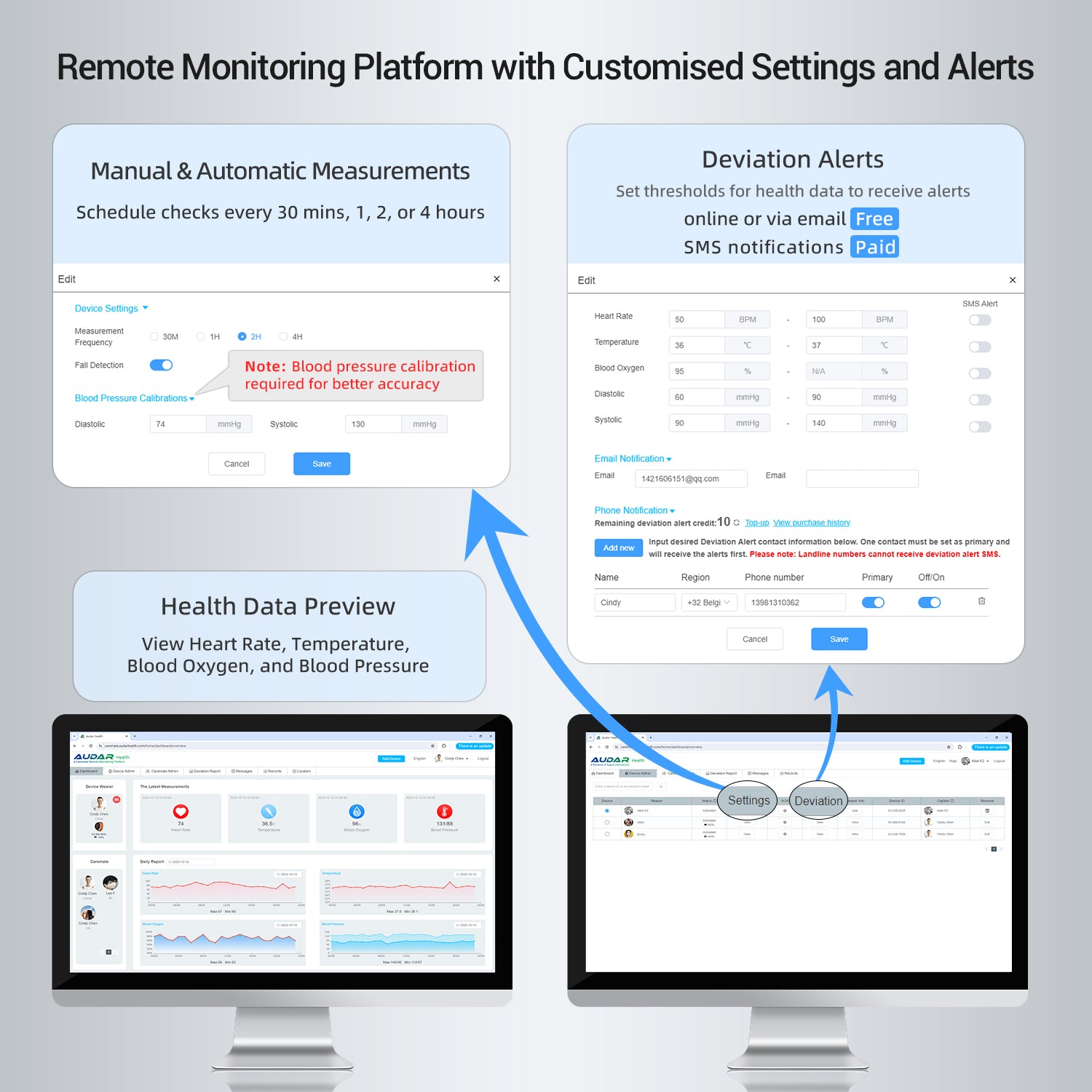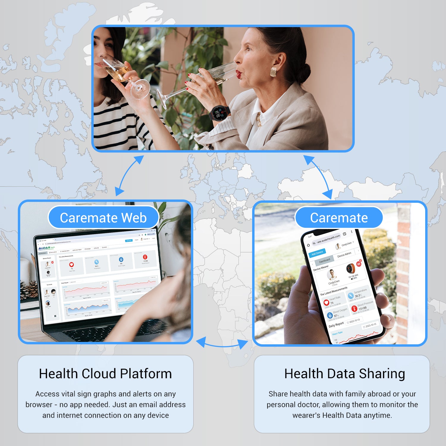 Unlike traditional health watches, The Audar E2 connects directly to the Audar Health Dashboard via an embedded SIM which eliminates Wi-Fi, app store, brand and even Bluetooth requirements! This allows instant SOS alerts and detailed health reports anywhere worldwide, making it invaluable for seniors, caregivers, and workplaces alike.