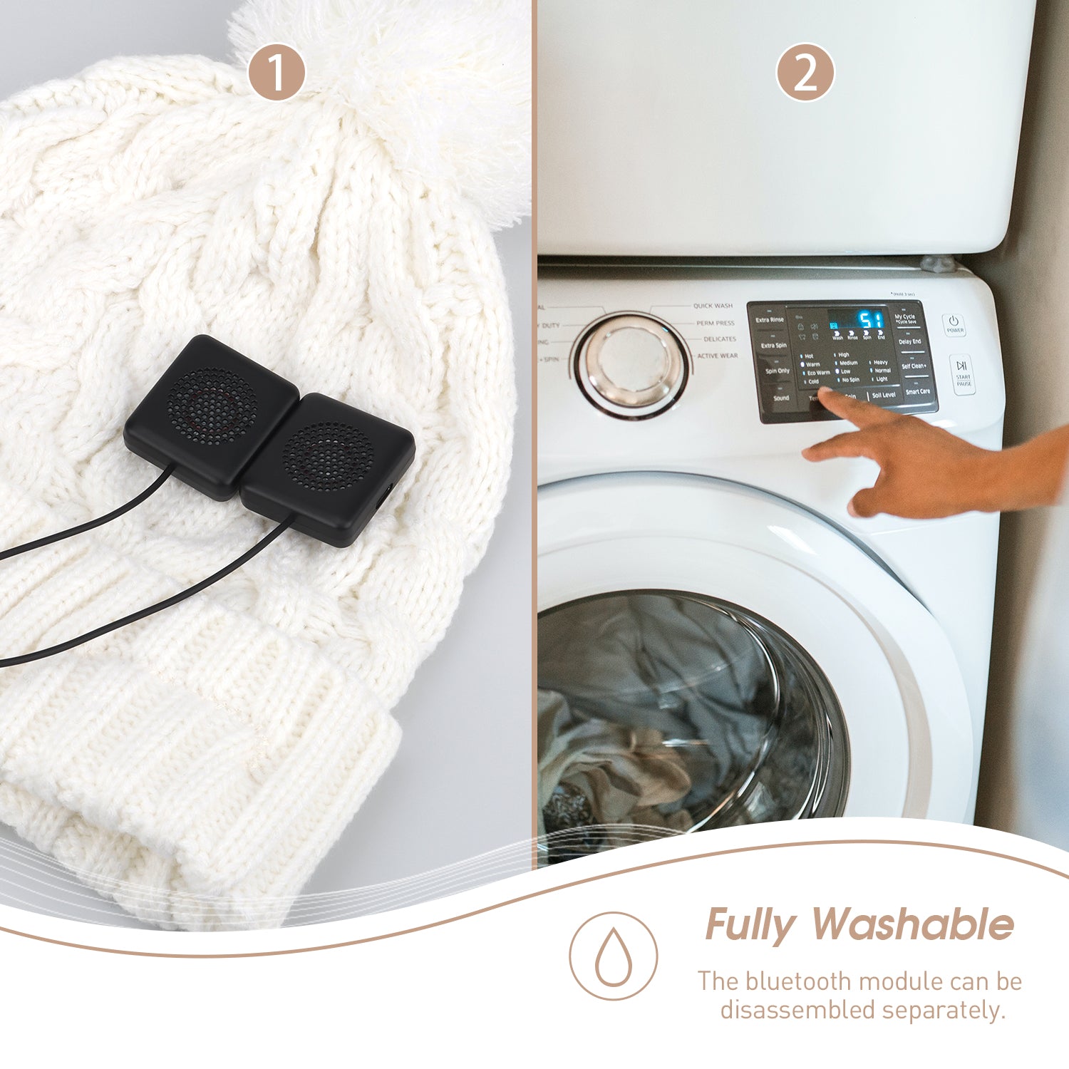 The speakers are connected via Bluetooth 5.0 to ensure snappy connectivity and high audio quality for music, radio, podcasts or whichever audio you choose from Bluetooth transmitters like phones, PCs, TVs and more. Keep warm inside and out this winter with your favourite songs and a cosy pom pom hat.
