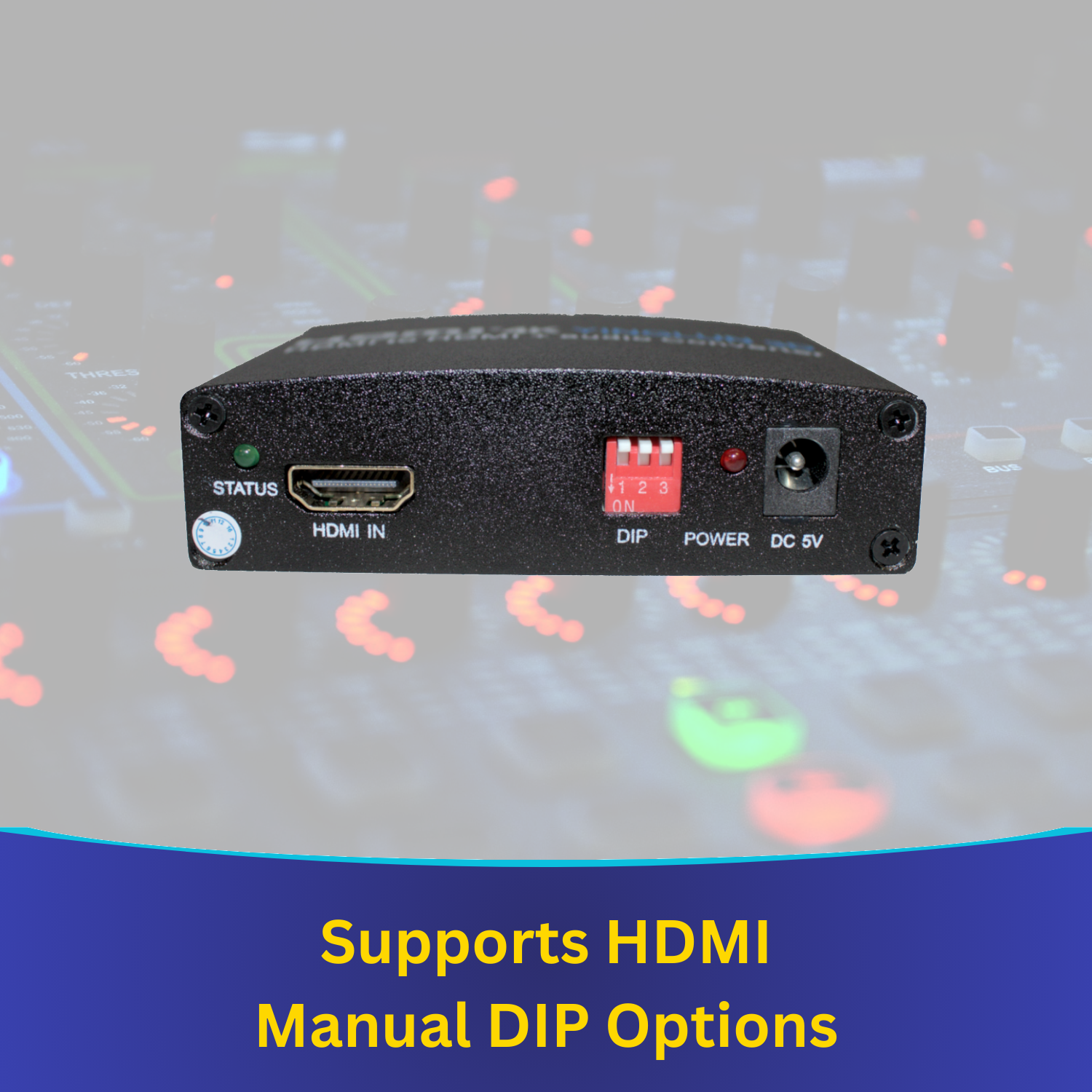 When splitting audio from HDMI, use the DIP switch on the unit to assign the audio to copy the HDMI, split into two 3D audio channels, split in to two channels with HD audio, or split into one channel of SD audio. This allows compatibility with a huge range of audio set-ups.