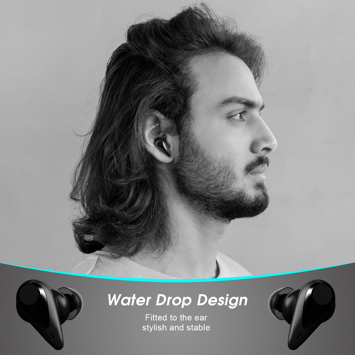 The Bluetooth Earbuds have a modern style that suits everyone. Including touch controls allows you to manage the volume and skip songs easily and comfortably while protecting your ear from clunky button jabbing. The Earbud’s ergonomic waterdrop design provides extra comfort during prolonged use and exercise.