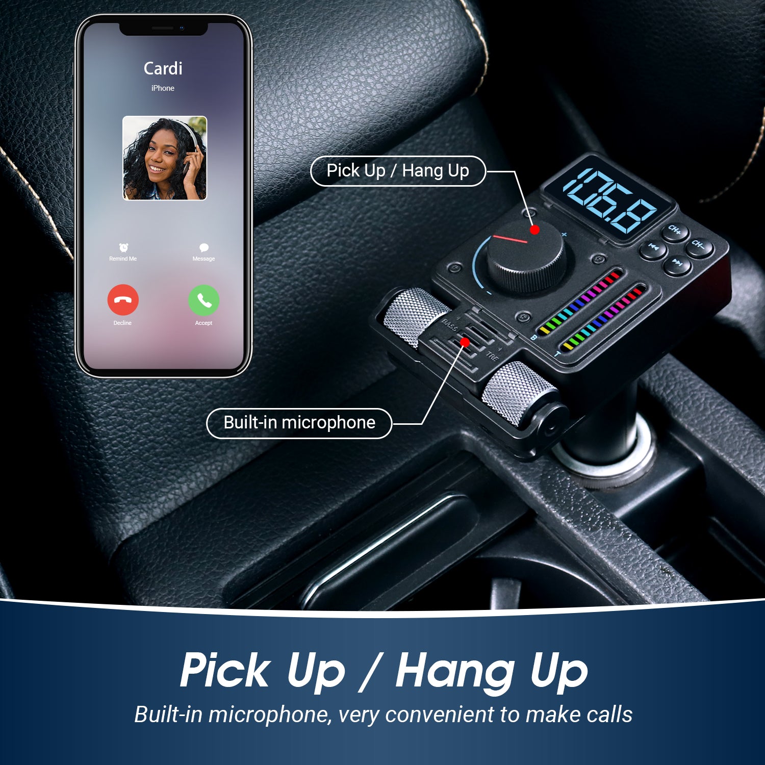 A Bluetooth FM adapter for car works by connecting your phone, tablet and other devices via Bluetooth, in this case, Bluetooth 5.3 for full HD and stereo audio. Then, the adapter broadcasts that audio over FM frequency (Selectable with the satisfying click buttons on the device) to your car stereo. Tune your stereo and the adapter to the same FM channel and enjoy seamless wireless audio right away!