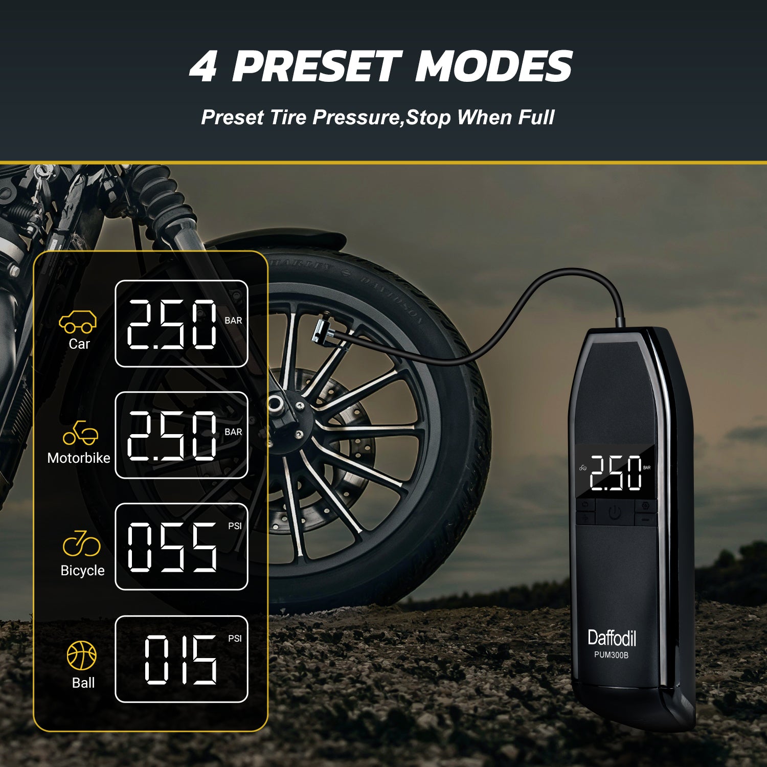 The features of the PUM300 make it the perfect travelling or camping air pump. It is engineered with versatility and adaptability in mind, featuring programmable pre-set pressures in your chosen units. This means that in emergencies you don't have to calculate PSI or worry about estimating pressures, you can simply use the pre-set for that situation (Your Car Tyre, Bike Tyres, Airbed etc) and get it reinflated straight away.