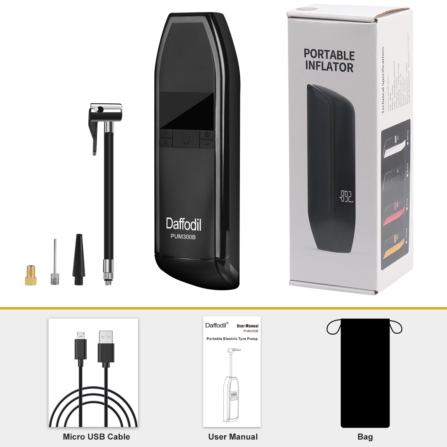 The PUM300 also sports 3 nozzle adapters, and a handy carry case. The pump, together with the adapters including a Needle Adapter for balls, can be stored and accessed easily from a glove compartment, camping box, backpack and more.