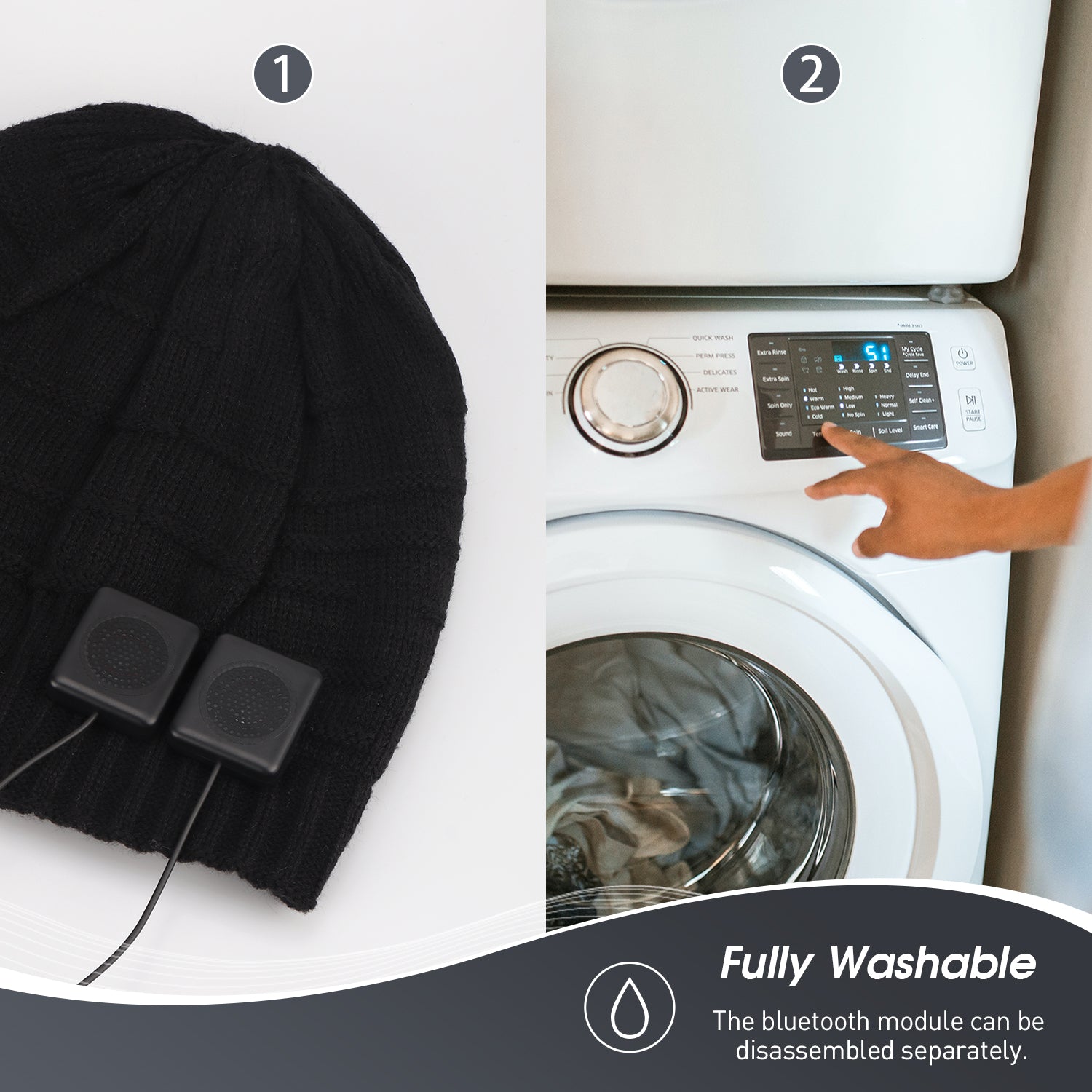 The beanie is fully machine washable with a removable unit containing the speakers and cable. They can be slipped easily back into the hat and aligned properly with the control panel, which cleverly looks like a leather brand stamp as you see on non-Bluetooth beanies!